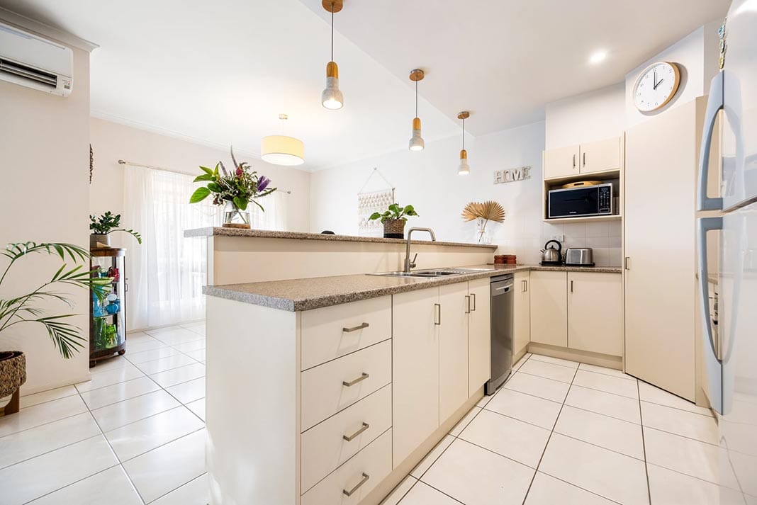 The open-plan kitchen, dining, and living area is warm and welcoming, ideal for quiet evenings or casual entertaining. The kitchen includes a gas cooktop, dishwasher, and generous storage, all framed by soft, neutral tones that enhance the tranquil feel throughout.