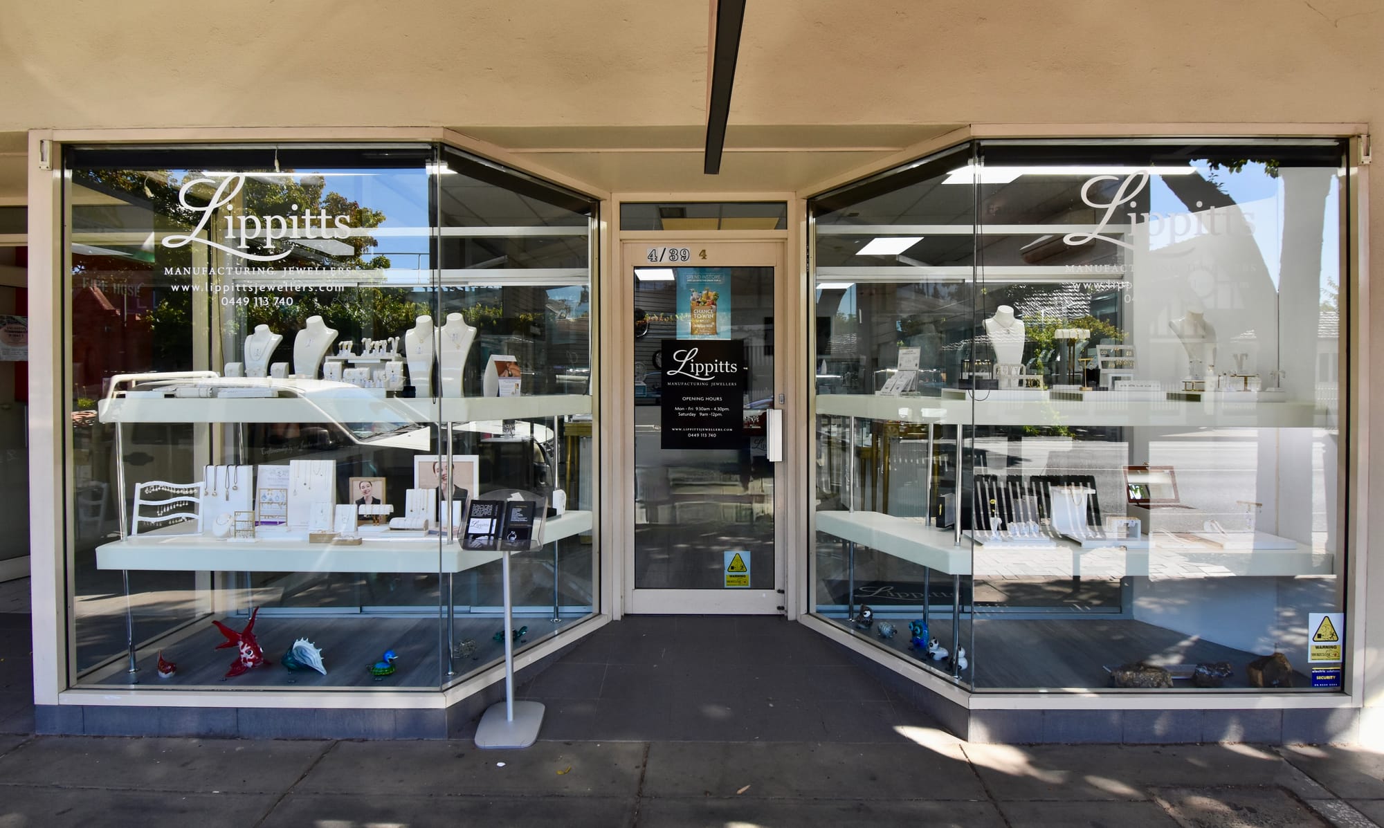 The bright, welcoming interior showcases elegant display cases filled with beautifully crafted items. Lippitts Manufacturing Jewellers is conveniently located at Shop 4/39 Murray Street, Nuriootpa.