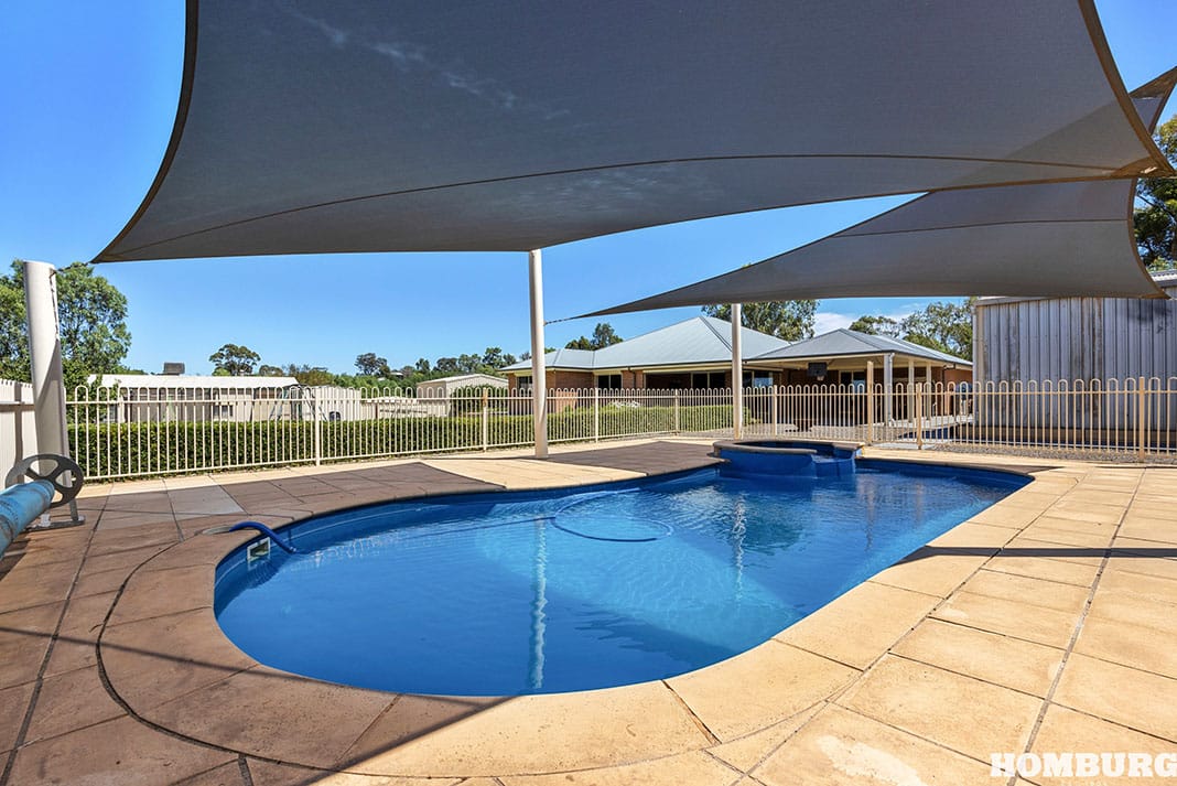 These spaces overlook the backyard lawn, a garden, a solar-heated pool, and two rear paddocks complete with dams fed by a creek, ideal for stock, crops, or hobby farming.