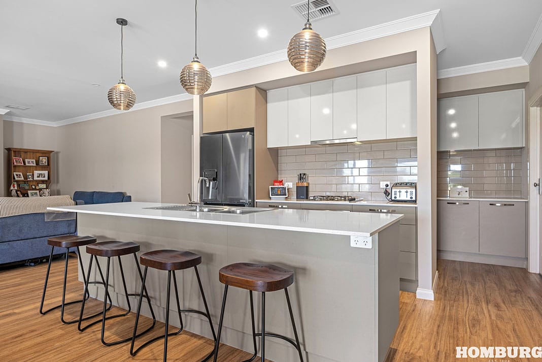 The open-plan family room and kitchen serve as the heart of the home, featuring stone benchtops, feature pendant lighting, and a large walk-in pantry with additional bench space. The kitchen also offers ample storage to meet all your needs.