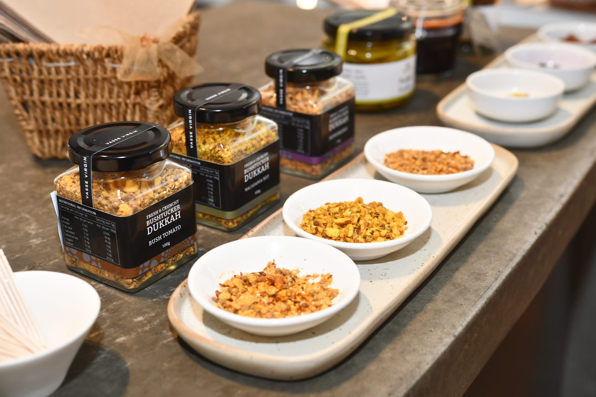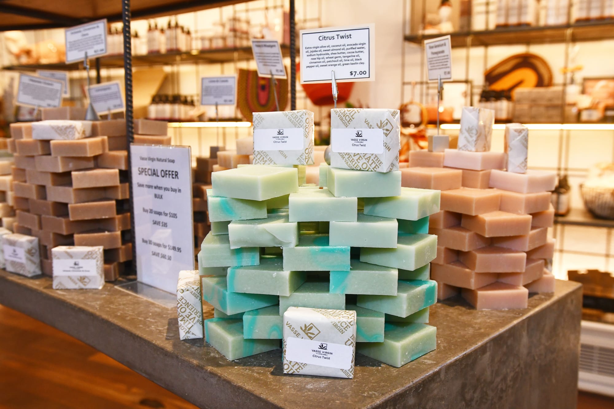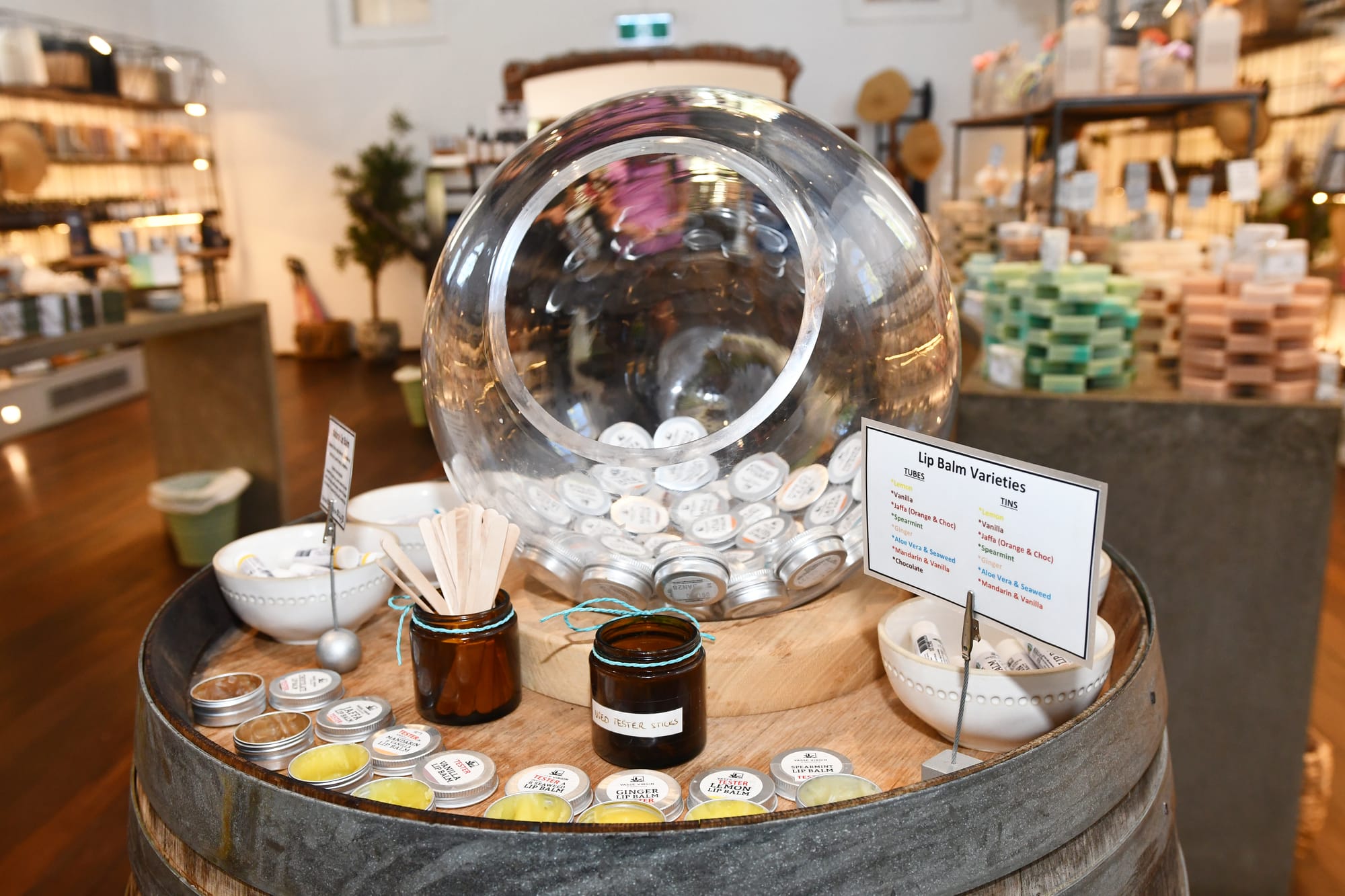 LEFT: Dukkah available for tasting. MIDDLE: An array of lip balms, available in either sticks or pots. RIGHT: Soaps made on site are displayed beautifully.
